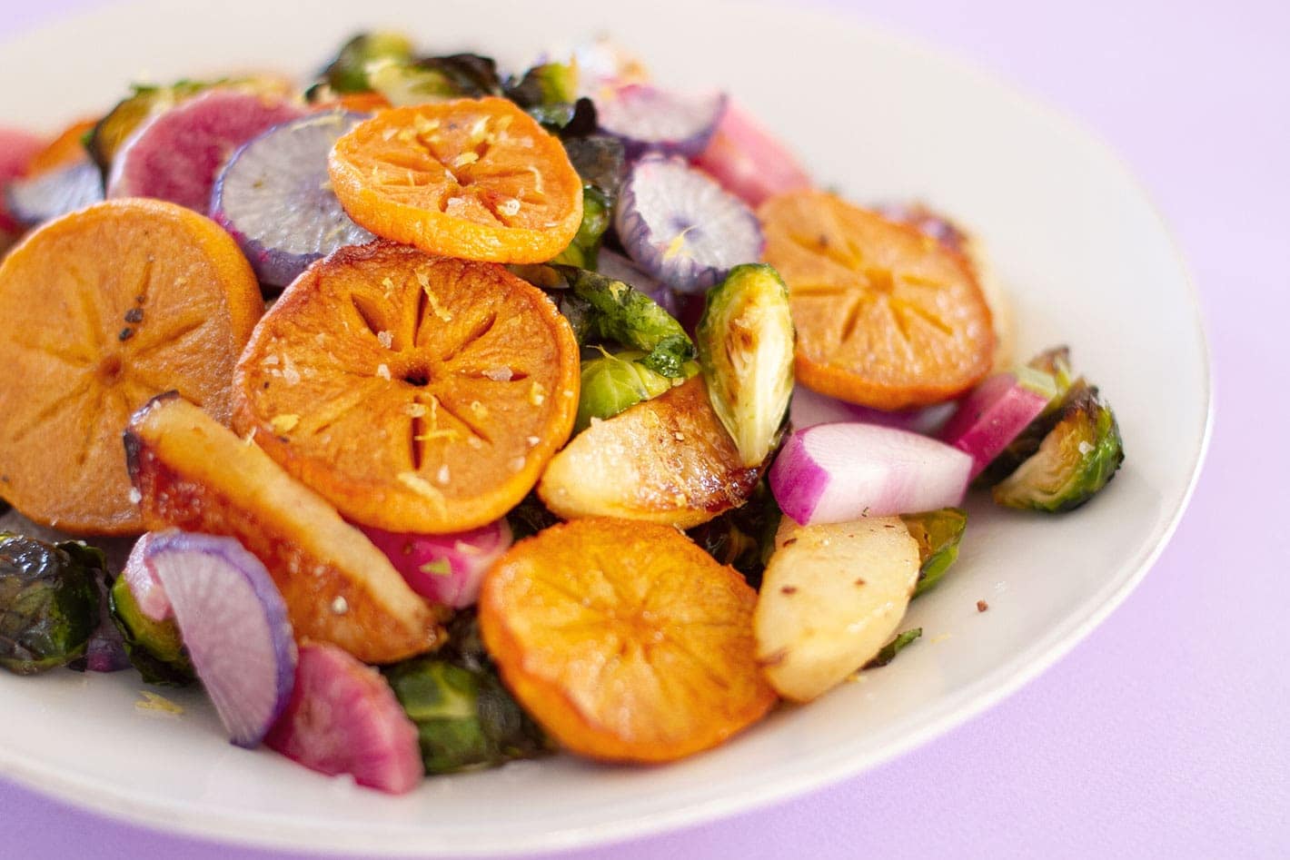Every fall, I wait for fuyu persimmon season like some people wait for pumpkin spice. The persimmons caramelize in the oven, getting even sweeter, with this warm, almost vanilla-like depth. The brussels sprouts crisp up perfectly.